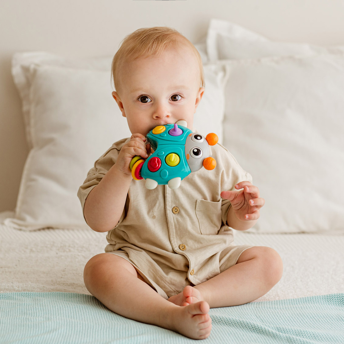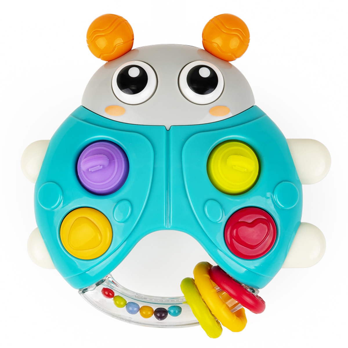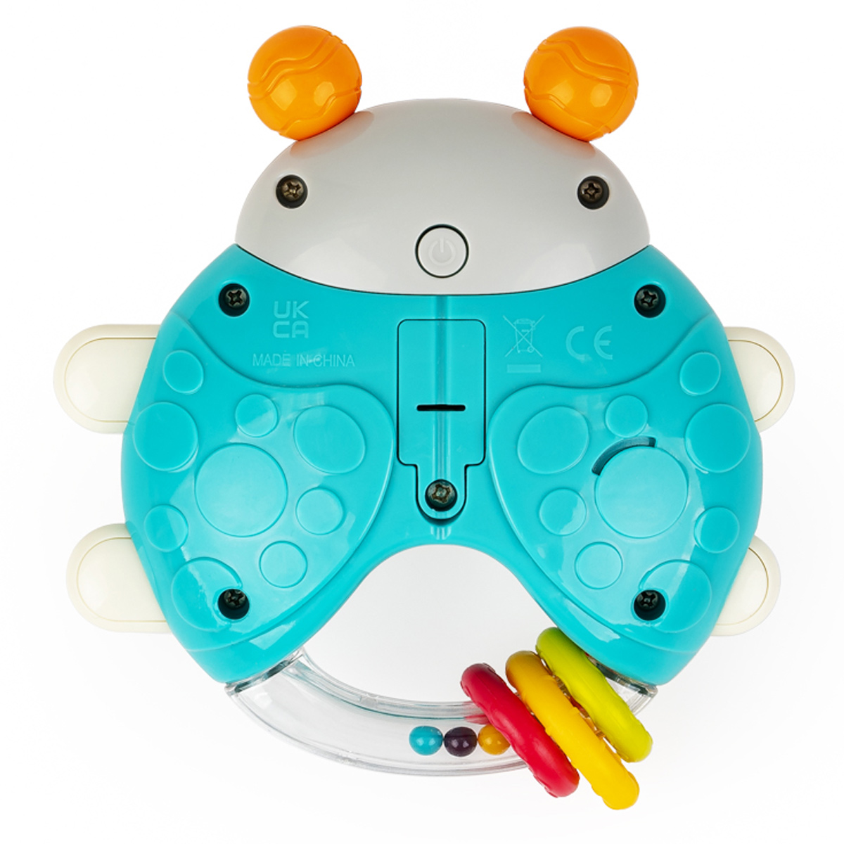 Uroczy żuczek z brzuszkiem pełnym dźwięków i światełek, zabawi maluszka na różne sposoby! Ten wesoły owad posiada wciskane odnóża, które po naciśnięciu jednego z kolorowych guziczków, wysuwają się na zewnątrz. Także czułki są ruchome, a ich obracanie sprawia, że żuczek zabawnie kręci oczkami. Przyciski na brzuszku odpowiadają za uruchamianie dźwięków, melodii i podświetlenia przycisków. Żuczek posiada praktyczny uchwyt, który ułatwia małym rączkom trzymanie zabawki. Jest on ozdobiony ruchomymi pierścieniami, a w jego wnętrzu kryją się koraliki, które wesoło grzechoczą, przy potrząsaniu zabawką. Produkt przeznaczony jest dla dzieci od 3 miesiąca życia.